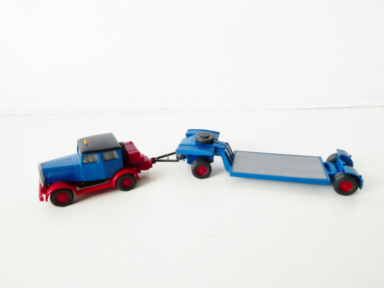 - H0 Wiking 502 Nákladní automobil HANOMAG ST 100 Veteran s přívěsem na přepravu vozidel TOP STAV NEPOUŽITÉ v orig. krabičce